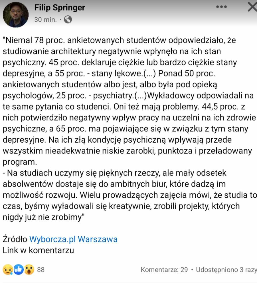Z drugiej strony nieustannie słychać narzekania na stan zawodu, zarobki, wyrabianie nadgodzin, że jest wiele lepszych zawodów na „A”, a określenie architekt zostało zawłaszczone przez programistów. Pojawiają się alarmujące artykuły o kondycji psychicznej studentów architektury i wypaleniu zawodowym projektantów.
