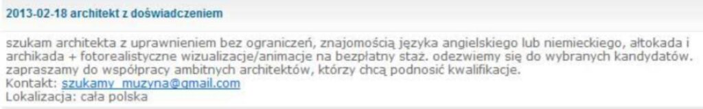z ogłoszeniami o pracę dla architektów. Mamy 2024 roku, a wciąż możemy znaleźć ogłoszenia dosłownie jednozdaniowe: „zatrudnimy architekta”. Jako ciekawostkę, wklejam jeszcze prześmiewcze ogłoszenie sprzed ponad 10 lat, które przypomniał mi wczoraj FB: